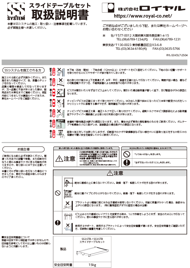 外観・仕様は改良の為、予告なく変更する事がありますのでご了承ください。本カタログの表示価格には、配送、設置調整費、また消費税は含まれておりません。本カタログに記載の数値は、検査機関及び当社で測定したものですが個体差があり必ずしもその数値を保障するものではございませんのでご了承ください。ご注文の際は必ず品番、数量、ご希望納期をご連絡ください。商品の色は印刷の具合で実物とは若干異なる場合があります。内装や金属加工などの経験がない専門業者以外の方独断での判断で施工・加工はしないでください。当社の商品は知的財産権所有の商品です。(国内外特許・実用新案・意匠登録など)本カタログの著作権は全て(株)ロイヤルに帰属いたします。イラストや写真、その他本カタログの内容を使用されたい場合は必ず事前に当社の了承を得てください。