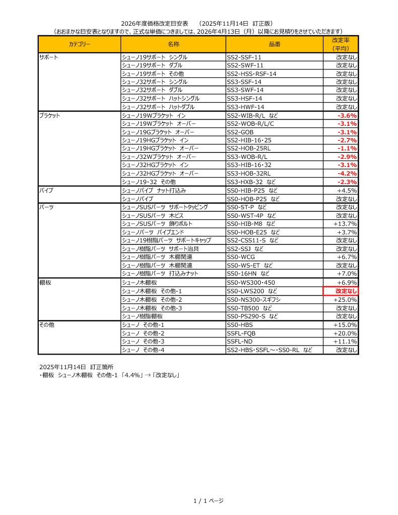 2026年度 価格改定目安表へも反映いたしましたので、合わせてご確認ください。