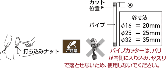 パイプの片方をカットし、パイプの内バリをヤスリで落とします。その後、打ち込みナットをパイプに当てて樹脂または木のハンマーで徐々にたたき入れます。