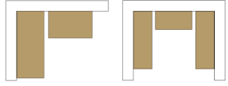図のようにL型・U型で同じ高さに棚板を設置する場合、取り外し時に干渉して可動できないおそれがありますので、棚板と棚板の間は10mm以上(シューノ32は15mm以上)空けてください。